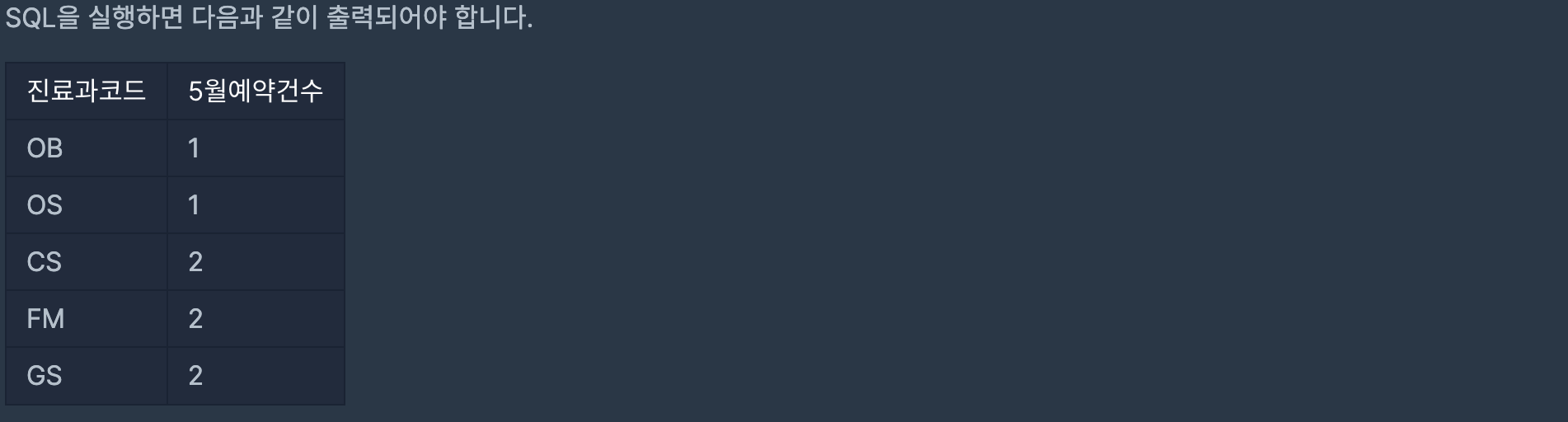 이때, 컬럼명은 '진료과 코드', '5월예약건수'로 지정해주시고 결과는 진료과별 예약한 환자 수를 기준으로 오름차순 정렬하고,