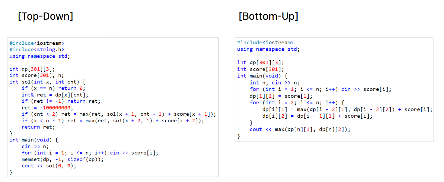 dp[n][1] 는 2계단을 점프해 왔으므로 max(dp[n-2][1], dp[n-2][2]) + 현재 서있는 계단의 점수